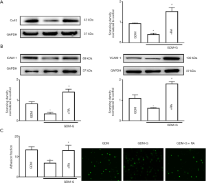 On the other hand, the Cx43 enhancer, RA, was used to up-regulate Cx43 expression in HUVECs. Figure 4A shows that when GDM-HUVECs were pretreated with normal glucose (5.6 mM, 7 days), Cx43 expression was down-regulated. However, exposure to RA could reverse the down-regulation of Cx43 expression in GDM-HUVECs. Figure 4B,C show that when GDM-HUVECs were pretreated with normal glucose (5.6 mM, 7 days), the decreases in cell adhesion and ICAM-1 and VCAM-1 expression that were induced by normal glucose (5.6 mM, 7 days) culture could be reversed by RA exposure, because Cx43 expression in GDM-HUVECs was re-upregulated.