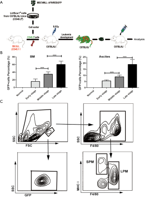 Most macrophages are derived from hematopoietic stem cells; however, some originate from early embryonic stem cells. Educated macrophages in tissue microenvironments are known as tissue-specific macrophages (4). Tissue-specific macrophages show heterogeneity in different organs and tissues, and heterogeneity even exists among macrophages in the same tissue (9). Macrophages in the same tissue are also heterogeneous in different pathologic microenvironments. Phenotypically, educated resident macrophages show great variation, depending on the microenvironment. Phenotypic and functional heterogeneity has reportedly been found in macrophages in the blood system, nerve tissue, connective tissue, and glomerular mesangial tissue; however, little attention has been paid to peritoneal macrophage heterogeneity (7). To date, there have been few reports about the heterogeneity of peritoneal macrophages and no studies on the characteristics of peritoneal resident macrophages in leukemia. Therefore, in the present study, the dynamics and functions of peritoneal macrophages in different physiological subsets and peritoneal macrophage polarization were explored in mice with acute myeloid leukemia (AML). We present the following article in accordance with the ARRIVE reporting checklist (available at http://dx.doi.org/10.21037/atm-21-139).