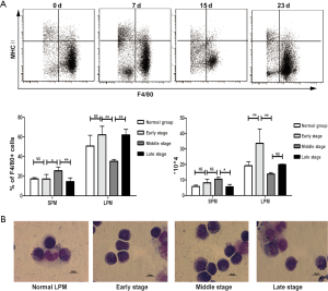 With the progression of leukemia, the number of SPMs in the abdominal cavity firstly increased and then decreased, while the number of LPMs showed the opposite pattern. Neutrophils are also involved in AML progression, and the number of F4/80low neutrophils first increased and then decreased. In the AML model, the number of LPMs in the metaphase was increased (Figure 2A). A morphological comparison with sorted leukemia cells was performed through Wright-Giemsa staining. We found that the vacuolation of LPMs occurred in the middle and late stages of AML onset, and the proportion of LPMs increased with leukemia progression (Figure 2B).
