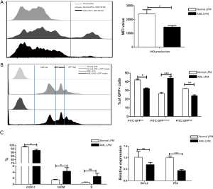 A nitric oxide fluorescent probe was used to detect the active nitrogen content of LPMs in different microenvironments, comparing the killing ability of macrophages. The active nitrogen content of AML-LPMs was significantly lower than that of normal LPMs, which was different from the gene expression of iNOS (Figure 4A). Macrophages in different microenvironments were used to phagocytize FITC-GFP+ particles; it was found that FITC-GFPmedium was the main type of AML-LPM, but FITC-GFPlow and FITC-GFPhigh were the main types of normal LPMs (Figure 4B). There were significant differences in phagocytic function between AML-LPMs and normal LPMs. Propidium iodide staining revealed more G2/M/S phase cells among AML-LPMs, showing that AML-LPMs have the potential for proliferation; however, normal LPMs did not have this function (Figure 4C).
