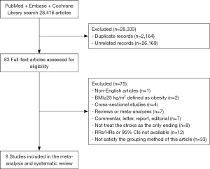 We complied with the recommendations made by the Meta-Analysis of Observational Studies in Epidemiology Group, the 2009 guidelines of Preferred Reporting Items for Systematic Reviews and Meta-Analyses (PRISMA) (17,18). PubMed, Embase and Cochrane Library were thoroughly searched from December 1946 to January 2019. The following scientific search strategy was used: (“stroke” OR “cerebrovascular” OR “cerebral” OR “transient ischemic attack” OR “TIA” OR “hemorrhage” OR “hemorrhagic”) AND (“Metabolic*” OR “metabolism”) AND (“obese” OR “obesity” OR “overweight” OR “BMI” OR “body mass index” OR “waist circumstance”). We also manually searched the biographies of eligible studies and related meta-analyses to find possible missing studies.