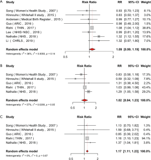 In an overall analysis of eight studies involving 4,256,888 participants (15,16,22-27), metabolically healthy individuals with BMI ≥25 kg/m2 had a higher risk of stroke compared with MH-NW individuals (RR =1.09, 95% CI: 0.99–1.19) (Figure 2A) with non-significant heterogeneity (I2=36%, P=0.14).