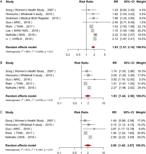As expected, all groups with metabolically unhealthy status had a similarly increased risk of stroke. In a pooled analysis of eight studies (15,16,22-27), the MU-NW group had an increased risk of stroke compared to the MH-NW group (RR =1.83, 95% CI: 1.57–2.14) (Figure 3A) with obvious heterogeneity across studies (I2=86%, P<0.01). In a pooled analysis of 5 studies, a significant association was found between MU-OW phenotype and a higher risk of stroke (RR =1.93, 95% CI: 1.44–2.58, I2=88%, P<0.01) (Figure 3B), and a similar result was found for MUO phenotype (RR =2.00, 95% CI: 1.40–2.87) (Figure 3C) with obvious heterogeneity across studies (I2=91%, P<0.01). Subsequently, sensitivity analyses were conducted to explore the sources of heterogeneity. Finally, the study of THIN (16) fully explained the heterogeneity (Figure S1). After carefully comparing this study with other studies, we found that this study only used the medical history provided by the participants rather than rigorous laboratory tests to determine whether participants had metabolic complications of obesity, such as elevated blood pressure, high triglycerides, decreased HDL-C and diabetes. After excluding this study, the heterogeneities in MU-NW, MU-OW and MUO phenotypes were reduced to 52%, 0%, and 30%, respectively. The pooled effects did not vary substantially after excluding this single study (MU-NW: RR =1.95, 95% CI: 1.71–2.22; MU-OW: RR =2.23, 95% CI: 1.95–2.54; MUO: RR =2.30, 95% CI: 1.73–3.06) (Table S2).