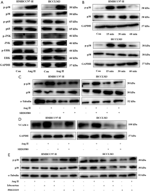 The p38/MAPK pathway was involved in the Ang II promotion of VCAM-1 in HCC cells