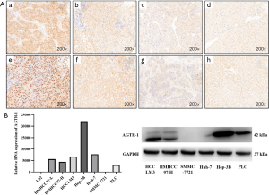 By immunohistochemical staining, we confirmed that AGTR-1 was expressed in human HCC tissues and that AGTR-2 was expressed weakly (Figure 1A). Next, the RNA and protein expression levels of AGTR-1 in commonly used HCC cell lines and the immortalized liver cell line L02 were analyzed (Figure 1B,C). The Hep-3B line had the highest expression level of AGTR-1, and the SMMC-7721 cell line had the lowest expression level of AGTR-1. The expression levels of AGTR-1 in the HMHCC97-H and HCCLM3 cell lines were relatively high. Considering the tumorigenic capacity of each HCC line in animals, the HMHCC97-H and HCCLM3 lines, which have highly aggressive and metastatic abilities, were finally selected as the main model cells in our study (40,41).