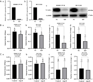 The expression of VCAM-1 at the RNA level in commonly used HCC cell lines was tested, and the HMHCC97-H and HCCLM3 cell lines, which have high VCAM-1 expression, were selected for the knockdown of VCAM-1 by lentiviral transfection (Figure 4A). Cell adhesion experiments were performed to test the adhesion of these two cell lines with VCAM-1 knockdown. The adhesion of HMHCC97-H and HCCLM3 cells to HUVECs decreased after VCAM-1 was knocked down (PHMHCC97-H =0.003; PHCCLM3 =0.006; Figure 4B-a and b). In vivo, lung metastasis model experiments showed that the number of metastases was significantly reduced after VCAM-1 knockdown (PHMHCC97-H =0.013; PHCCLM3 =0.018; Figure 4B-c and d; n=6 per group; no adverse events). The in vitro and in vivo results suggested that VCAM-1 expression in HCC cells was related to the adhesion of HCC cells to endothelial cells. Cells with a high expression of VCAM-1 had a strong adhesion ability.