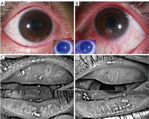 Tear break-up time (TBUT) was measured using fluorescein solution under slit-lamp (24). The severity of MGD was graded by meibography using a Keratograph 5 M (Oculus; Wetzlar, Germany) as previously reported; that is, 0 for no meibomian gland loss (MGL), 1–2 for less than one-third total MGL and considered as ‘mild’, 3–4 for one-third to two-thirds total MGL and considered as ‘moderate’, and 5–6 for more than two-thirds total MGL and considered as ‘severe’ (25). Tear meniscus height (TMH) was also evaluated under a Keratograph 5 M. According to a published corneal grading scale, corneal pathologies were graded by slit-lamp photographs as ‘0’ for no abnormal finding, ‘1’ for superficial punctate keratopathy (SPK) only or limbitis only, or ‘2’ for stromal involvement such as infiltration or ulceration (7).