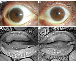 A 52-year-old woman complained of irritation and dryness for four years. She was previously diagnosed with MGD and was treated with artificial tears. On examination, her vision was 20/20 and 20/25 respectively. Lash sampling detected nine D. folliculorum. Both eyes had meibomian gland orifice plugging, irregular lid margin, and mild conjunctival hyperaemia (Figure 2A,B). Meibography showed mild MGL in both eyes (Figure 2C,D).
