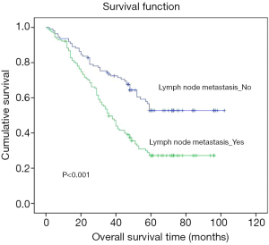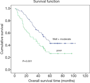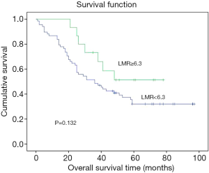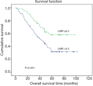 No substantial variation within the two classes within footings gender, smoking, drinking, category 2 diabetes, hypertension, lymph node metastasis, pathological type, differentiation degree, or clinical stage (P>0.05). Table 1 shows that major modifications within phase, gender, tumour size, and pathological type within top and below LMR classes (P<0.05).