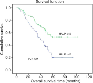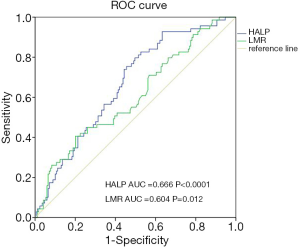 Predictive value of the hemoglobin, albumin, lymphocyte, and platelet (HALP) score and lymphocyte-to-monocyte ratio (LMR) in patients with non-small cell lung cancer after radical lung cancer surgery