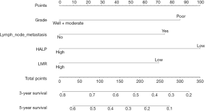 The influencing factors of OS (P<0.05) were lymph node metastasis, gradation of differentiation, pathological level, HALP, and LMR, according to univariate study. As shown in Tables 2 and 3, preoperative HALP and LMR remained independent risk aspects for tumor progression (P=0.005, P=0.028), while lymph node metastasis and degree of differentiation also had a certain effect on tumor progression (P<0.05).