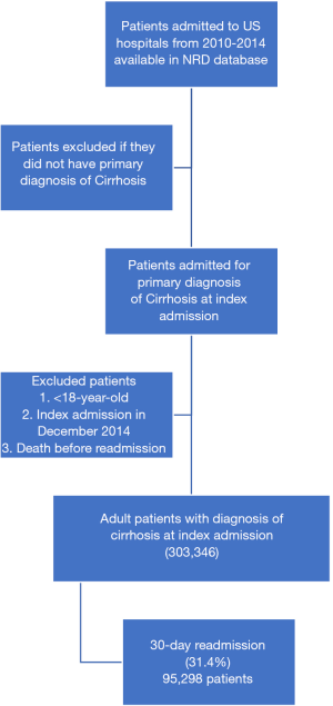 From the NRD we retrieved data on all adult patients (age ≥18 years) who met the inclusion criteria of hospital discharge with primary diagnosis of cirrhosis (ICD-9-CM codes 571.2, 571.5, and 571.6) during the index hospital admission from January 2010 through November 2014 and who were readmitted within 30 days after discharge from the index admission. The first hospitalization during the study period was considered the patient’s index admission. All index admissions during December 2014 were excluded from the study because subsequent 30-day follow-up data were not analyzed in these cases. Furthermore, if a patient had more than one readmission within 30 days of the initial discharge, only the first episode of readmission was included in the analysis (Figure 1). The study was conducted in accordance with the Declaration of Helsinki (as revised in 2013).