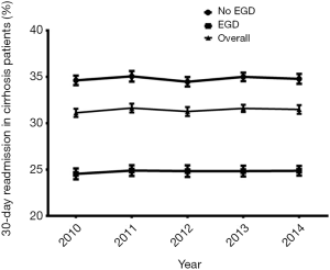Overall, there were 303,346 patients with a primary diagnosis of cirrhosis on index hospitalization during the study period. Of these, 95,298 patients (31.4%) were readmitted within 30 days after discharge for cirrhosis-related complications coded as ICD-9 (456.0, 456.1, 572.2, 572.3, 572.4 and 789.59). The rate of readmission over the 5-year study period remained stable (Figure 2).