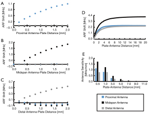 In using linear actuators to displace a stainless steel plate from the proximal antenna, while positioning identical stainless steel plates in static adjacency to the midspan and distal antennas (Figure 2A), the proximal antenna experienced a 1.081 MHz ARF shift while the midspan and distal antennas ARF shift magnitudes were ≤0.051 MHz (Figure 5A). Similar analysis at the midspan antenna produced a 2.110 MHz ARF shift at the midspan antenna, and ARF shift magnitudes at the adjacent antennas were ≤0.010 MHz (Figure 5B). When this test was performed with the distal antenna, a 0.541 MHz ARF shift was produced at the distal antenna, and the other antennas experienced ARF shift magnitudes of ≤0.067 MHz (Figure 5C). These data demonstrated that three coiled antennas could be used in close proximity (≥4 cm) to each other with minimal effect on adjacent antennas’ ARF (i.e., antenna cross-talk) as a function of implant displacement.