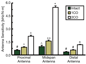 To clarify the sensitivity of the developed DEC antenna array to changes in fracture site stiffness, fracture healing was simulated by progressively reducing the mid-diaphyseal stiffness of cadaveric ovine metatarsals treated by 9-hole LCP (Figure 3A). For each fracture state, four-point bending was applied to the metatarsal to produce physiologically relevant LCP deflections which were simultaneously measured by the DEC antenna array. A characteristic plot of antenna sensitivity as a function of location and fracture state for a single representative sample is provided in Figure 6. For the 2CO fracture state, all samples exhibited significantly different antenna sensitivities at all antenna locations. For all samples, the antenna sensitivity at the fracture site was significantly greater for the 2CO state than the 1CO and intact states, and the 1CO state was significantly more sensitive than the intact state for the majority of samples (6 of 8 samples). At locations away from the fracture site (i.e., the proximal and distal antennas), the majority of samples exhibited significantly greater antenna sensitivity for the 2CO state than the 1CO and intact states (7 of 8 samples).