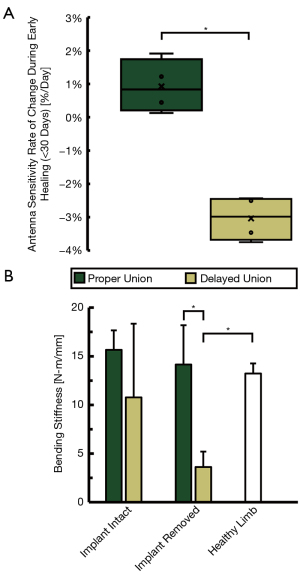 Additional improvements for DEC must be centered upon real-time identification of aberrant fracture healing. While the current system was able to identify significant differences in healing pathway during the first 30 days post-fracture, this result was obtained during post hoc analysis. For clinical utility, it is imperative that fracture healing outcome be identified within the initial stages of healing, rather than in retrospective analysis. The predictive ability of this technology may potentially be improved with additional insights into the mechanical progression of fractures from additional translational studies of larger populations with diverse fracture types. Furthermore, interpretation of early healing DEC diagnostic data would benefit from increased antenna sensitivity to facilitate improved characterization of the rapidly achieved fracture stiffness of properly healing fractures.