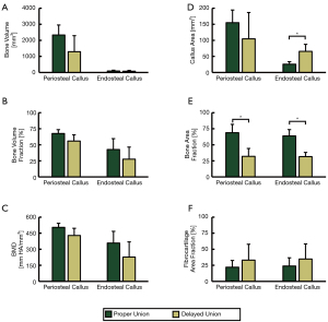 According to postmortem histomorphometry analyses, mean callus area for the endosteal callus was not significantly different for the PU and DU fracture models (155.0±39.4 and 104.8±82.0 mm2, respectively; Figure 10D), but were significantly different in the endosteal ROI (25.7±7.8 and 65.8 ±21.8 mm2, respectively; Figure 10D). Additionally, the mean observed area fraction of bone within the periosteal callus and endosteal callus were significantly higher (P=0.009 and P=0.003, respectively) for animals of the PU model (68.9%±13.0% and 63.8%±9.9%, respectively) than the DU model (32.1%±12.2% and 31.6%±6.4%, respectively, Figure 10E). Mean area fraction of fibrocartilage tissue was higher in both callus ROIs for the DU fracture group, but these differences were not statistically significant (Figure 10F).