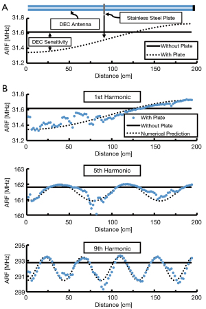 During DEC antenna design experiments, introduction of stainless steel to the linear coaxial cable antenna induced large ARF shifts of some harmonics, while having little to no effect on the ARF of other harmonics. This supports the conclusion that this antenna type is effective at detecting the presence of orthopaedic plates, with the antenna sensitivity varying by location and resonant frequency harmonic number. Locations of maximum antenna sensitivity are of paramount importance for designing antennas to measure orthopaedic hardware deflection as these locations maximize the measurable ARF shift for small changes in antenna-plate displacement.
