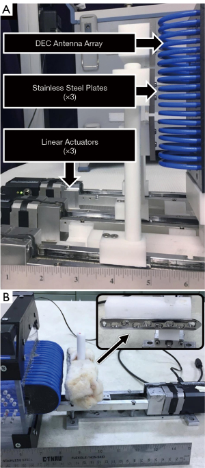 Simultaneous DEC measurement at multiple discrete locations may provide clinically useful data. For example, multi-location measurements may provide useful information in cases of complex fracture types where multiple orthopaedic implants may be utilized on the same bone. To create a diagnostic antenna capable of measuring in multiple discrete regions, it was necessary to produce an array of multiple antennas. The array was selected to feature three individual antennas to facilitate discrete DEC measurements of the proximal, midspan, and distal thirds on a long bone. Three antennas were produced and stacked so that their DEC regions of sensitivity aligned linearly. A series of experiments were performed to select the antenna designs, including measurement harmonic numbers, so that changes to the DEC coupling distance in one antenna would elicit little to no effect in the ARF of the other antennas (i.e., cross-talk). A custom testing fixture was designed to enable three stainless steel plates, of combined dimensions comparable to one orthopaedic fixation plate (40 mm × 20 mm × 10 mm, per plate), to be individually displaced by precision linear actuators (T-LLS105; Zaber Technologies; Vancouver, BC, Canada) to independently alter the DEC coupling distance of each antenna in the array (Figure 2A). The distance between each plate and antenna were sequentially increased (0.0–2.0 mm, 0.2 mm increments) while measuring the ARF of each antenna in the array. ARF of the proximal and distal antennas were measured using S11 and S22 measurements, respectively, from a two port VNA (R&S ZVB4; Rhode & Schwarz; Munich, Germany; 1,000 linearly spaced frequency measurement points spanning 20 MHz window centered upon initial ARF; 10 dBm supplied power) while ARF was measured via S11 of a second VNA (Tektronix TTR500; 500 linearly spaced frequency measurement points spanning 10 MHz window centered upon initial ARF; 10 dBm supplied power). Experiments were conducted with parametrically differing designs for each antenna until a design exhibited minimal change in antenna ARF when the DEC coupling distance was changed for an adjacent antenna (i.e., the ARF of each antenna would only change if the coupling distance was changed for that specific antenna). A set of antennas designed for measurement at the 25th harmonic exhibited this behavior and were utilized for more thorough follow up tests.