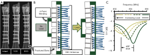 To address these limitations, our research group has developed a diagnostic system capable of measuring temporal changes in the relative fracture callus stiffness for any fracture treated with standard off-the-shelf orthopaedic hardware stabilization devices, without the need to modify existing hardware design (50). This diagnostic relies upon fractures with orthopaedic implant fixation behaving as a composite structure, where stiffness of the healing fracture tissues and the implanted hardware both contribute to the stiffness of the composite structure. Since it can be assumed that the implant’s stiffness remains constant during healing, changes to the stiffness of the healing fracture site yields quantifiable changes to the stiffness of the bone-implant composite. Our research group has developed a diagnostic device which quantifies this stiffness by applying a physiologic non-detrimental mechanical load to the fracture site (i.e., stabilized bone) while measuring the induced deflection of the fixation hardware via direct electromagnetic coupling (DEC) with an external antenna (51). Succinctly, the external telemetric DEC antenna electromagnetically couples with the implanted hardware positioned in its near-field region, resulting in an apparent resonant frequency (ARF, in the MHz range) which shifts with changing distance between the coupled members. Thus, measuring ARF shifts during controlled mechanical loading provides a non-invasive means to indirectly measure the stiffness of a fracture treated by any existing metallic orthopaedic implant. Theoretically, temporally repeated DEC measurements can thus indicate if proper healing progression is occurring, as indicated by temporally increasing relative fracture stiffness, or if healing progression has slowed or stopped, as indicated by invariant fracture stiffness prior to fracture union.