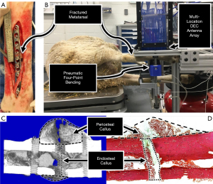 Experiments were performed under a project license (No.: 19-8990A) granted by the Colorado State University Institutional Animal Care and Use Committee, in compliance with United States and state of Colorado guidelines for the care and use of animals. Eight skeletally mature sheep (Rambouillet cross, female, >3 years of age) were utilized for this study, and housed in Colorado State University Veterinary Teaching Hospital facilities for the duration of the study. Sheep were selected for this experimental model due to their similarity to humans in several facets pertinent to the study of bone healing: body weight, bone macrostructure (52), bone mineral composition, cortical bone microarchitecture, and bone healing rates (53). The animals were anesthetized and the fracture site was sterilized according to standard surgical practices. A 10-cm skin incision was made over the lateral aspect of the metatarsal. Overlying soft tissue and periosteum were elevated from the bone. A 9-hole LCP (VP4045.09; DePuy Synthes; Warsaw, IN, USA) was contoured to the metatarsal and the required holes were drilled under saline irrigation. An osteotomy was created at the metatarsal midspan by oscillating surgical saw under saline irrigation. Proper union (PU) and delayed union (DU) surgical models were created by producing a 3-mm or 6-mm osteotomy, respectively, according to results from a previous pilot study. The animals were evenly and randomly divided between the two fracture models. The plate was then attached to the bone using four bicortical locking screws in each bone fragment with the middle screw hole centered over the osteotomy gap. The middle screw hole was filled with the head of a locking screw in order to reduce the risk of plate failure (Figure 4A) resulting from the large stress-riser of an unfilled screw hole at the fracture site. The surgical site was closed using standard suturing techniques. The animals received immediate hard casting on the treated limb and were allowed to freely ambulate. The hard cast was bi-valued to facilitate temporary removal for DEC testing and radiographic imaging during the initial stages of healing, and was removed permanently after 3-weeks post-surgery.