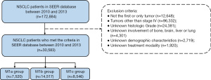 Patients were selected from the SEER database, which includes clinical records for cancer occurrences in 18 areas of the United States corresponding to approximately 27.8% of the population (19). The study was conducted in accordance with the Declaration of Helsinki (as revised in 2013). SEER*Stat Database: Incidence, SEER 18 Regs Research Data (with chemotherapy recode), Nov 2015 Sub (2000–2013) software (version 8.3.5; seer.cancer.gov/seerstat) was used to identify patients with NSCLC diagnosed from 2010 through 2013. Patients with lung cancer were selected using ICD-O-3 codes (C34.0–C34.9). SEER database includes information on patient demographics, the position and morphology of a primary carcinoma, the stage of a tumor at diagnosis, the first treatment modality, and survival status. Only patients who were diagnosed with stage IV NSCLC at the initial diagnosis and had only one malignant primary in lifetime were included. Figure 1 details the selection process for the inclusion of patients. All patients were at least 18 years old. Patients with tumors that were stage I to III, unknown follow-ups and basic information, or unknown bone involvement, brain involvement, liver involvement, or lung involvement and patients diagnosed by autopsy or death certificate were not included in the study. As a result, we selected a total of 30,583 patients in our cohort for analysis.