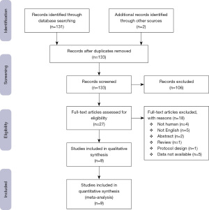 A total of 133 articles were identified in the initial screening, including 131 from the electronic databases and two from other sources. Of these articles, 106 were excluded as irrelevant studies. The full-text screening was conducted on 27 publications. Nine publications were eventually selected for data extraction and meta-analysis (17-25) (Figure 1). Three studies were two-arm randomized control trials (23-25), and 6 were single-arm studies (17-22) (Table 1).