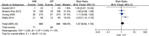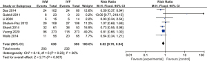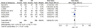 Similarly, a meta-analysis for the difference in clinical pregnancy rate between IVM and IVF groups was conducted. The result showed that there was no significant difference in the clinical pregnancy rate among the two groups (RR =0.90, 95% CI: 0.79–1.01, P=0.08, fixed-effects model), while clinical pregnancy rate among the included studies showed low homogeneous (P=0.19, I2=31%) (Figure 5).