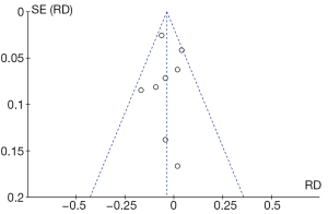 We performed a funnel plot to evaluate the publication bias for recovery rate qualitatively (Figure 9). The Figure 9 showed that the shape was symmetric. The P value of the Egger test was 0.519, which indicated that no significant publication bias existed in this meta-analysis.