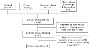 We identified 865 studies following our electronic search. Following abstract reading and analysis, 816 articles were excluded because they did not meet the study’s inclusion criteria. Of these, 49 articles were further excluded because of different study designs or insufficient data available. Finally, eight papers met the selection criteria and were included in the meta-analysis (16-23). The search process and full inclusion/exclusion criteria are shown in Figure 1.