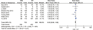 A total of eight studies reported fertilization rate. The forest plot showed no significant difference between the IVM and IVF groups (RR =0.93 with 95% CI: 0.86–1.00), while the P value of overall effect was 0.07 and I2=48% (Figure 4). We performed a sensitivity analysis by removing Shavit et al.’s 2014 study, and I2 changed from 48% to 39%, which indicated that the results of included articles were robust (Figure 8).