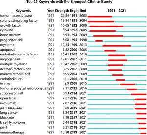 We used CiteSpace V software to generate a keyword co-occurrence map (Figure 7). The top 10 keywords in terms of frequency of use and centrality are listed in Tables 14 and 15. For keywords with high frequency, we use CiteSpace to perform burst detection on keywords (Figure 8). We can observe the transformation of colony stimulus factors, growth factors, cytokines, tumor necrosis factors at the beginning into currently commonly used drugs, immunotherapy. This reflects the gradual transformation of research in this field, from the initial analysis of microenvironmental components to immunotherapy. It is also a typical process of medical research, the evolution from potential mechanism research to clinical intervention.