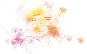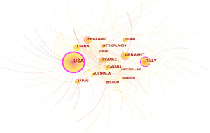 We use CiteSpace V software to analyze data and generate national visualization maps (Figure 3) and institutional visualization maps (Figure 4). The results show the top 5 countries for the number of papers published in this field are the United States, Italy, China, Germany, and the United Kingdom; the top 5 centrally ranked countries are the United States, Italy, Germany, Spain, and France (Tables 3,4). The results suggest that the United States is in a leading position in research in this field. The institutional analysis also shows that institutions that have published many papers and those with more collaborations are also mainly from the United States (Tables 5,6, Figure 4).