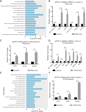 To compare the regulatory role of miRNAs-target mRNAs in inflammation in the GCs of patients with PCOS and in PNA mice, we performed RT-qPCR analysis of the expression of miR-106a-5p and miR-155-5p in GCs from six patients with PCOS and six patients in the control group. In the GCs from women with PCOS, the expression of miR-106a-5p and miR-155-5p was significantly downregulated; this was similar to the changes observed in the PNA mice (Figure 4D) and supported a similar regulatory role for miR-106a-5p and miR155-5p in PCOS.