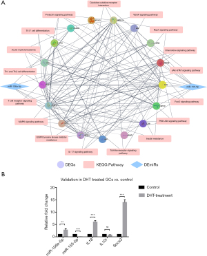 To investigate the molecular mechanism of the hyperandrogenic phenotype of PCOS, the PNA mouse model was used for our research. To identify the differentially expressed genes (DEGs) and differentially expressed microRNAs (DEmiRs) in the ovarian tissues of PNA and control mice, we performed RNA-seq and miRNA-seq, respectively. We then constructed a regulatory network between the miRNAs and negatively regulated target mRNAs and identified the biological pathways that were significantly associated with DEGs and DEmiRs. The expression of the selected miRNAs and target genes was validated in animal models and clinical samples using RT-qPCR. In addition, we treated GCs with DHT in vitro to examine whether androgens had a direct effect on cells. We aimed to investigate whether miRNAs dysregulation is potentially involved in the pathogenesis of PCOS in mice. We present the following article in accordance with the ARRIVE reporting checklist and STROBE reporting checklist (available at https://dx.doi.org/10.21037/atm-21-1288).