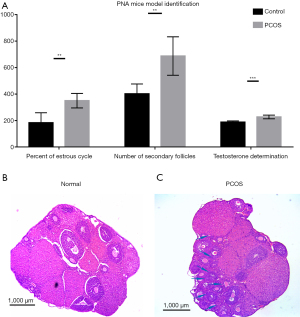 To confirm the establishment of the PCOS model, we randomly selected six PNA mice and six control mice and assessed estrus duration, serum testosterone level, and the number of secondary follicles at 8 weeks of age. Vaginal smears were undergone daily and last for at least one complete estrous cycle to assess estrous duration. To assess the serum testosterone level, we collected the serum from each mouse in diestrus by removing the eyeball after anesthetizing with chloral hydrate. The serum testosterone level was assessed by the enzyme-linked immunosorbent assay (ELISA) kit (Beckman Coulter, Inc., USA) and microplate reader (BioTek, Inc., Winooski, USA).