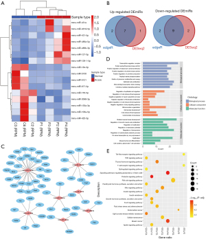 Briefly, after data quality inspection and preprocessing, the clean reads were mapped onto the reference mouse genome mm10 using the bowtie2 (version 2.1.0) (12). The mapped tags were then aligned against miRBase (version 22.1), and read counts were calculated by customized script (13). Expression level change with an absolute value of |log2FC| ≥1, RPM ≥0.1, and P value <0.05 were considered significant and used for further analysis. The target genes of DEmiRs were predicted through the miRTarbase database. Then functional analysis was performed by clusterProfiler (14). Raw sequence data of miRNA-seq were uploaded to the GEO database (https://www.ncbi.nlm.nih.gov/geo/) and presented in the dataset GSE168166.