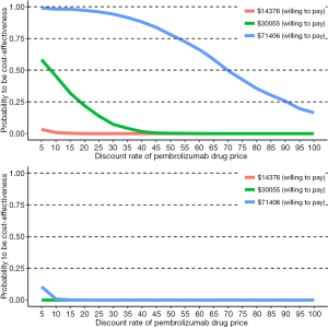 To avoid bias, we conducted comprehensive sensitivity analyses including one-way deterministic sensitivity analyses and PSA. The cost-effectiveness results were robust to changing the inputs for most of the sensitivity analyses. A considerable effect on ICER was seen when changing the price of pembrolizumab or body weight. As a result, adjust the drug price could significant influence the cost-effective of pembrolizumab, higher price of pembrolizumab could lower its cost-effectiveness, to improve the cost-effective probabilities for pembrolizumab requires a decrease in the drug price. In China a decrease in the drug price often occurs as medical reform continues to advance (26). As for pembrolizumab, the donation policy in China is also considered as a kind of drug price reduction strategy for first-line treatment of NSCLC. Therefore, we analyzed the influence of a drug price decrease on the result of the ICER. We found >95% probability of cost-effectiveness for pembrolizumab 2 mg/kg treatment regimen was reached with WTP set as $71,406/QALY when the price was 25% decreased.
