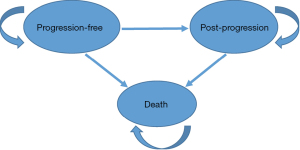 Based on data from clinical trial KEYNOTE-010, a partitioned survival model was developed and adapted for cost-effective analysis. The partitioned survival model was programmed and implemented using the ‘heemod’ package in R software (The R Project for Statistical Computing. https://www.r-project.org/). Patients were simulated in three states [PFS, post-progression (PP) and death] in the model (Figure 1). These three states are mutually exclusive, which means that one patient can only exist in one of three states at any given time. All patients start in the PFS state. Once the disease progresses, the patient moves from the PFS state to the PP state, from where they can progress to death or remain in PP; it is not allowed to return to the original PFS state from the PP state in the model. In addition, PFS could progress to death (terminal state) without going through the PP state. The proportion of patients in the PFS and terminal states at any time is determined directly from the PFS and OS data; the proportion of patients in the PP state is calculated as OS minus PFS. In accordance with the schedules of pembrolizumab and docetaxel, the simulation was conducted on a 3-week cycle, with a time horizon of 630 cycles, during which time over 99% of the simulated patients would die, and represent the lifetime horizon for patients with advanced NSCLC (17). Because each health state has a specific cost and quality-of-life adjustment weight (or utility), the cumulative cost and quality-adjusted life years (QALYs) over the time range can be accessed by calculating the time duration of each state. Analyses were performed from the perspective of the health service system.