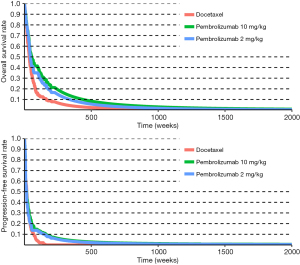 Kaplan-Meier (KM) data were used to estimate PFS and OS in the model until reaching the cutoff date of KEYNOTE-010. The time points for pembrolizumab and docetaxel in PFS were 218 and 157 weeks respectively, and in OS were 227 and 225 weeks respectively. After that time point, subsequent KM data of PFS are estimated by using a function fitting method. The best-fit parametric functions were chosen according to the Akaike information criterion and the Bayesian information criterion (Table S1). Because the 2 and 10 mg/kg pembrolizumab dose groups were pooled in the published long-term PFS and OS data, the estimated long-term PFS and OS for the two dose groups were split by applying a hazard ratio (HR) derived from KEYNOTE-010. Following long-term KM estimation of PFS and OS, the applied HR was also used in the best-fit parametric functions. As subsequent split and fitted data did not accurately come from the clinical data, we performed a sensitivity analysis of the HR and function parameters.
