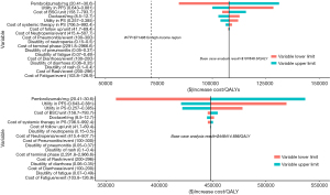 Utilities for patients with NSCLC in China were mainly determined according to Nafees et al.’s study (19), in which the utilities were elicited from a societal perspective using the standard gamble method in several countries including China. As reported in the published study, the utility score of 0.804 for PFS state and 0.321 for PP state were used in our study, Adverse events (AEs) in the PFS state were also considered as disutilities in the model; the most five common AEs associated with KEYNOTE-010 patients were assigned disutility scores by applying the published data or consulting oncologists.