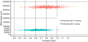 Of note, the effectiveness difference of the two dose groups for pembrolizumab was not significant. The ICER difference between the two dose groups was mainly associated with the cost of pembrolizumab; that is, patients given the high dose of pembrolizumab (10 mg/kg) would gain more unnecessary cost, which goes against the cost-effectiveness principle. Besides, the risk of AEs might be higher in the pembrolizumab high dose group (10 mg/kg) for real-world patients, even though the AE results in the clinical study were similar between the two dose groups (9).