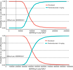 Based on the clinical trial results in patients with NSCLC, pembrolizumab could significantly improve OS and PFS compared with docetaxel. The fitted OS and PFS curves for both pembrolizumab (log-logistic distribution for OS curve, and log-normal distribution for PFS) and docetaxel (log-logistic distribution for OS) are presented in Figure 2. The life years (2.5 life years, 3.3 life years) of the pembrolizumab groups (2, 10 mg/kg) were higher than those of the docetaxel chemotherapy group (1.4 life years), and the total QALYs (1.2 QALYs for pembrolizumab 2 mg/kg group, 1.45 QALYs for pembrolizumab 10 mg/kg group) were also higher than those of the docetaxel chemotherapy group (0.70 QALYs). The differences of QALYs in the non-progressive state was 0.4 in the pembrolizumab 2 mg group and 0.51 in the pembrolizumab 10 mg group compared with the docetaxel group, and the differences in the PP state were 0.1 QALYs (pembrolizumab 2 mg) and 0.23 (pembrolizumab 10 mg). Economic analysis showed that the costs of each cycle of treatment with pembrolizumab ($138.31 in the pembrolizumab 2 mg/kg group, $586.23 in the pembrolizumab 10 mg/kg group) were higher than with docetaxel ($52.52). The lifetime direct medical costs of pembrolizumab were $87,134.79 and $369,326.82, respectively, in the two dose groups (2 and 10 mg/kg), which were $54,047.98 and $336,240.02 higher than the docetaxel chemotherapy group ($33,086.8). The ICERs were $107,846/QALY and $448,414 QALY for pembrolizumab (2 and 10 mg/kg) groups. Both ICER values are higher than the threshold of WTP for the general region ($30,055.01). Detailed base-case scenario results are given in Table 2.