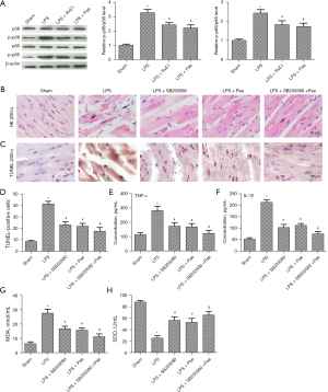 To understand the protective effects of Pae, the phosphorylation levels of p38 and p65 were examined by WB assay. The results from Figure 5A showed that LPS significantly increased the protein levels of p38 and p65 (Figure 5A), compared with the sham group. In contrast, Pae or RvE1 markedly inhibited the phosphorylation of p38 and p65 (Figure 5A). In addition, we added p38 inhibitor SB203580, and mice were randomly separated into groups: sham group, LPS group, LPS + SB203580 (10 mg/kg) group, and LPS + Pae (20 mg/kg) group, LPS + SB203580 + Pae group. HE staining showed SB203580 or Pae treatment obviously attenuated myocardial tissue injury compared with LPS group (Figure 5B), and SB203580 or Pae treatment reduced the apoptosis rate of myocardial tissues (Figure 5C,5D). Co-treatment with SB203580 and Pae made this change more obvious (Figure 5B-5D). The levels of TNF-α, IL-1β and MDA were significantly increased and SOD were dramatically decreased compared with sham, Pae remarkably decreased the levels of TNF-α, IL-1β and MDA while increased SOD compared with LPS. Moreover, SB203580 treatment significantly attenuated the effect of LPS. Co-treatment with SB203580 and Pae further reduced TNF-α, IL-1β and MDA, and elevated SOD compared with LPS + SB203580 (Figure 5E-5H).