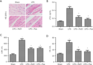 To explore whether Pae could prevent LPS-induced cardiac dysfunction, the myocardial sections were treated with HE staining. As shown in Figure 1A, there were no significant differences in cardiac morphology in the sham group. Nevertheless, myocardial fiber rupture, cellular edema, and inflammatory cell infiltration were occurred in the LPS group. Notably, treatment with Pae or RvE1 obviously attenuated myocardial tissue injury compared with LPS. In addition, we examined the release of relevant bio-markers (cTnI, CK-MB and LDH) in serum. Figure 1B-1D showed the level of cTnI, CK-MB and LDH were increased in LPS group. As expected, Pae or RvE1 reversed the change of cTnI, CK-MB and LDH, compared with LPS group.