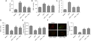 Furthermore, the indicators of oxidative stress (SOD, GSH, ROS and MDA) were also examined to assess oxidative injury of heart tissues. The data showed that the levels of MDA (Figure 3A), GSH (Figure 3B) and ROS (Figure 3C) were increased, while SOD (Figure 3D) was decreased after LPS treatment compared with sham group, but MDA, GSH and ROS were mitigated and SOD was elevated with Pae or RvE1 treatment compared with the LPS group (Figures 3A-3D).