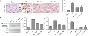 Next, the apoptotic rate of myocardial cells was examined by TUNEL staining. As shown in Figure 4A, we found a significant increase in apoptosis-positive cells after LPS induction. In contrast, treatment with Pae or RvE1 reduced the apoptotic rate in myocardial tissue. In addition, the protein levels of the apoptosis-associated markers (cytochrome C, Caspase-3, Bax and Bcl-2) were examined using WB assay. As shown in Figure 4B, the levels of cytochrome C, Caspase-3 and Bcl-2/Bax were significantly reduced in the LPS + Pae or LPS + RvE1 group as compared to the LPS group.