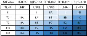 Patient survival is also affected by the total number of retrieved lymph nodes. This may be because of the therapeutic benefits of optimal lymphadenectomy, or because of the more accurate staging allowed by harvesting more lymph nodes, though the reason remains controversial. It is recommended that at least 12 lymph nodes should be retrieved to ensure optimal staging and reduce staging migration (2); however, the average number of retrieved lymph nodes is often <12 (9,10). This may be because many factors can affect the total number of retrieved lymph nodes, including surgical skills and technique, the way in which the pathologist collects the lymph nodes, the actual number of regional lymph nodes surrounding the tumor, and the patient’s immune response (11). Lymph node ratio (LNR) was therefore proposed as a measure to reduce stage migration (12-14). LNR is defined as the ratio between the number of metastatic lymph nodes and the total number of retrieved lymph nodes, and has been reported to have a higher predictive accuracy rate than pN stage, especially when an insufficient number of lymph nodes was retrieved (15).