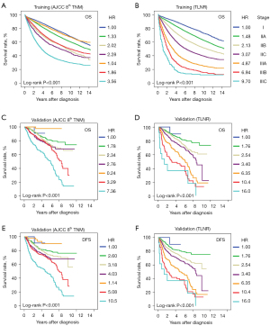 In the training cohort, we further combined the novel LNR and pT stages into 25 groups, with the HR value of T1LNR1 as the reference. The HR values of the 25 T and LNR stage combinations were ordered from lowest (T1LNR1) to highest (T4bLNR5) (Table 1). OS was then compared between two sequential stages using log-rank tests and 24 χ2 values were generated. The six largest values were identified as cutoff values (Table 1) and used to create seven categories of the novel TLNR classification that paralleled the AJCC 8th classification.