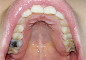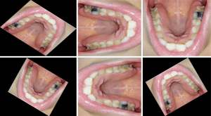 The frontal occlusal photo required the patient to expose the maximum number of teeth and gums and could be assisted by common objects. The upper teeth photo required the patient to open the mouth as much as possible and take a picture of the maxillary dentition. The patient was required to lie as flat as possible, with the maxillary occlusal surface at 90–120° to the floor after opening the mouth. The handpiece was held as low as possible, depressed or held upside down, and the full maxillary arch was photographed from the bottom up. The patient’s head was lowered slightly and their thumb and index finger were held slightly apart at the corner of the mouth while the handpiece was held diagonally upwards towards the bottom. For patients with smaller mouth openings, one photo of each of the right- and left-side teeth could also be taken. No pre-setting of lighting conditions, resolution, exposure, and other jumps in the photographic process were made for this study; all images were obtained by the device in the conventional photographic mode. In order to approximate the image effect in real-life scenarios, all images were captured using a smartphone and without professional equipment such as reflectors (Figures 1,2).